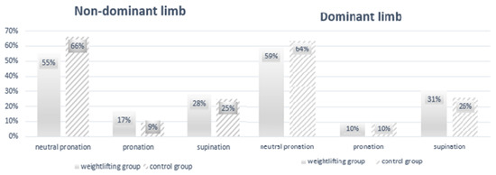 The majority of the participants in both groups showed neutral pronation, with overpronation the least common foot posture (Figure 1). Mean calcaneus angle and plantar axis was greatest in the weightlifting group for the dominant limb in the static condition although no significant between-group differences were observed for these two variables in the static condition (Table 2). Additionally, the calcaneus angle in both groups did not meet normative values (15–18°) [21]. Plantar pressure in the static condition was greatest in both groups at the rearfoot of the dominant limb. None of the between-group differences in plantar pressure distribution in this condition were statistically significant (Table 3). Correlation analysis between BMI, peak and average plantar pressure in the static condition found only a moderately significant correlation in the weightlifting group for the non-dominant limb. No significant correlations were observed in the control group (Table 4).