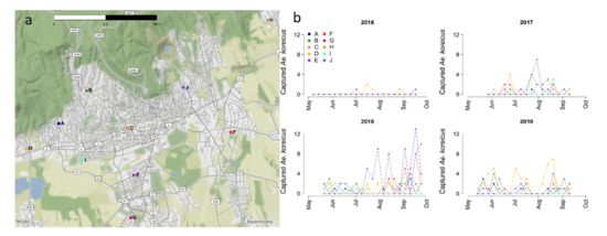 (a) Study area and traps (A–J) location. (b) Recorded number of trapped adult Aedes koreicus females per trap and year. Map data © OpenStreetMap contributors [31]. Numbers are presented in Table S1: Number of trapped Ae. koreicus for each trap and sampling date (Julian day of the year).