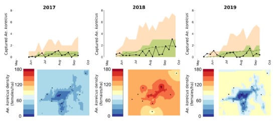 Mosquito city abundance was evaluated at a 100 m resolution by universal kriging considering human density as a predictor, since we found a significant relationship between these two quantities. As shown in Figure 2, we estimated a quite heterogeneous, both spatially and temporally, Ae. koreicus distribution over the city of Pécs. Average predicted summer density ranged between 8 and 57, 87 and 179, and 3 and 97 females per hectare in 2017, 2018, and 2019, respectively. The negative relationship with human density was more marked in 2017 and 2019, whereas for 2018, Ae. koreicus density was estimated to be larger and more homogeneous throughout the city, as expected, given the higher number of trapped mosquitoes.