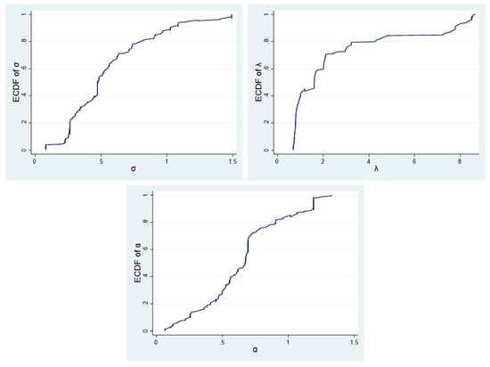 We carefully estimated each individual’s risk attitude parameters. The cumulative distribution function plots and kernel density estimation plots of the risk attitude’ parameters are shown in Figure 1 and Figure 2, respectively. The estimate of the risk aversion parameter σ (Mean = 0.56; SD = 0.33) was less than 1, suggesting that average Chinese fruit farmer is risk-averse in the gain domain. Notably, the estimate of σ was higher than that obtained in similar study in Africa (e.g., [37]). This comparison implies that the average Chinese fruit farmer in our sample is less risk-averse in the gain domain than the average cattle farmer in West Africa. Furthermore, the estimates of the loss aversion parameter λ (Mean = 2.59; SD =2.54) was more than 1, implying that the average Chinese fruit farmer appears to pay more attention to losses than gains. Additionally, the estimate of the probability weighting parameter α (Mean = 0.66; SD =0.30) was less than 1, which suggests that the average Chinese fruit farmer is unable to correctly assess probability information.
