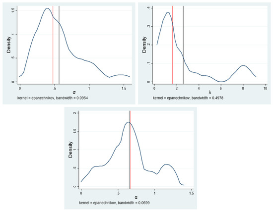 Kernel density estimation plots of risk attitude’ parameters. Notes: In the figure, the black line represents the mean value, and the red line represents the 50th quantile (i.e., the median).