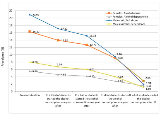 We have selected a total of nine manuscripts that delve into the alcohol consumption problem among young people and adolescents from different perspectives. Caamaño-Isorna et al. [], using data from Spit for Science: The VCU Student Survey, examined the impact of the delay in the age of onset of alcohol on alcohol abuse and alcohol dependence, and estimated a reduction of around 75% of alcohol abuse and alcohol dependence if the consumption of alcohol started at 18 as established by law, as displayed in Figure 1. We need to delay the age of onset of alcohol consumption in our youth. This issue is one of the main factors—if not the main factor—in the prevention of alcohol use disorders.