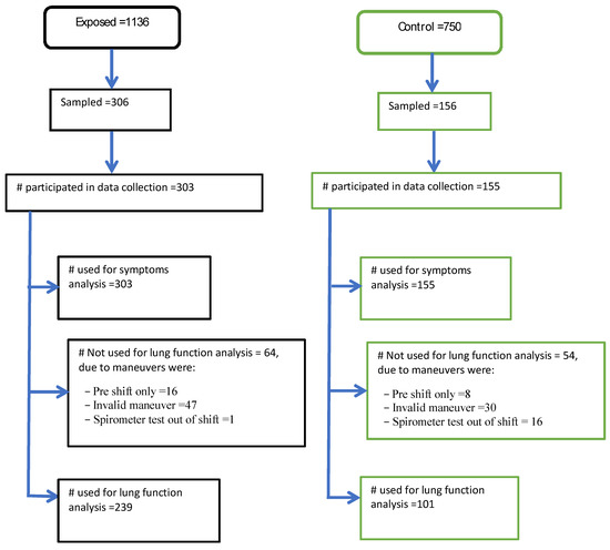 In all, 1136 production workers in the integrated textile factory and 750 workers in the control factories were available. A total of 462 workers (306 from the integrated textile factory and 156 from soft drink and water bottling factory) were selected for respiratory symptoms interviews and lung function spirometer measurements. The textile factory had four departments and within each department, a random sampling technique was used to select participants from a list of workers obtained from the human resource office at the factory. Sampled workers from the integrated textile factory departments were 81 out of 298 from spinning, 103 out of 380 from weaving, 52 out of 183 from finishing, and 70 out of 260 from garment. The controls were selected from both the production and administrative workers. A sample of 44 workers from the administration and 112 workers from the production personnel were selected randomly using the list of workers obtained from the human resource personnel (Figure 1).