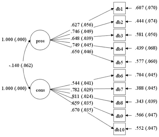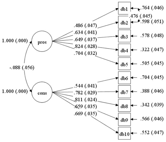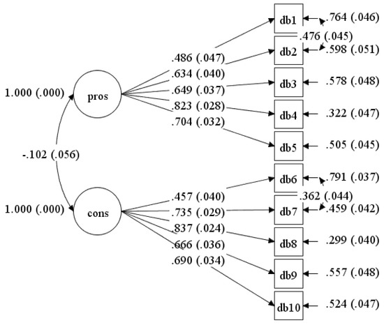 This study was designed to determine the psychometric properties of the DB scale when applied to undergraduate university students at the Health Campus, USM. The confirmatory analyses of ten items showed good fit indices and factor loadings for the model tested among undergraduate students. The initial model with ten items did not achieve the model fitness. Hence, re-specification was made based on high modification indices by correlating the residual for item DB2: “I would feel more confident about my health by doing PA” with item DB1: “Physical activity would help me reduce tension or manage stress”, as well as item DB7: “Physical activity would take too much of my time” with item DB6: “I am too tired to engage in physical activity because of my other daily responsibilities”. Based on theoretical support by Plotnikoff et al. [19], items DB1 and DB2 belong to the same advantages latent variable, while items DB6 and DB7 belong to the disadvantages latent variable. Hence, the inclusion of the correlated residuals was theoretically and statistically acceptable.