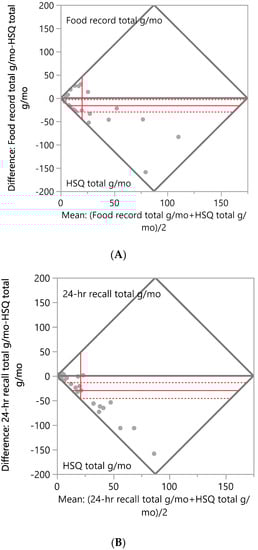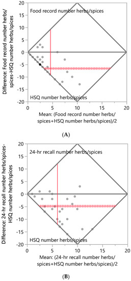 Bland–Altman Plots of the total grams of herbs and spices consumed per month. (A) Difference in total g/mo of herbs and spices consumed between the Herb/Spice Questionnaire (HSQ) and food records. N = 33 respondents; mean difference between methods = −15.8, Wilcoxon signed rank test, p < 0.05. (B) Difference in total g/mo of herbs and spices consumed between the HSQ and 24-h recalls. N = 29 respondents; mean difference between methods = −29.2, Wilcoxon signed rank test, p < 0.001. The mean difference is shown as the horizontal solid red line, with the 95% confidence interval above and below shown as red dotted lines. The mean of pairs is shown by the vertical red line.