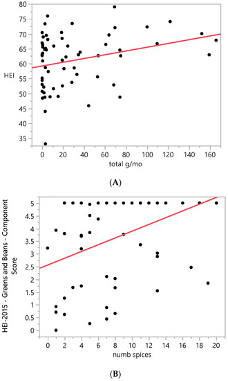 Correlational analysis showed a modest, significant positive correlation between total HEI and total g/mo consumption of herbs and spices recorded by the HSQ, with Pearson correlation coefficient = 0.3, p = 0.02, Figure 3A. The HEI component scores for greens + beans and total vegetables were also significantly correlated with HSQ total g/mo intake, both with Pearson correlation coefficient = 0.3, p = 0.02. HSQ number of spices consumed per month was weakly correlated with the HEI component score for total vegetables (Pearson correlation coefficient = 0.2, p < 0.0001) and modestly correlated with HEI component score for greens + beans: Pearson correlation coefficient = 0.4, p < 0.0001, Figure 3B. Total HEI and number of spices consumed per month were not significantly correlated.