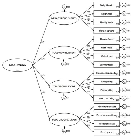 | Model 1 Latent Variable: Food Literacy; Observed Variables: 16 Items | Model 2 First-Order Latent Variables: Five Domains; Second-Order Latent Variable: Food Literacy; Observed Variables: 16 Items | Model 3 First-Order Latent Variables: Four Domains; Second-Order Latent Variable: Food Literacy; Observed Variables: 16 Items | Model 4 First-Order Latent Variables: Knowledge, Skills; Second-Order Latent Variable: Food Literacy; Observed Variables: 16 Items | |
