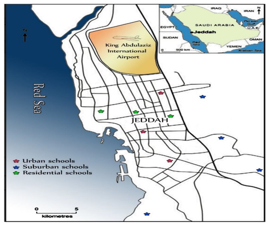 Classroom air conditioner filter dust samples, which represent all of the exposed dust that has migrated to the indoor environment, were collected from primary schools in urban, suburban and residential areas of Jeddah (Figure 1), the second largest city of Saudi Arabia. Almost all the air pollutants near the sampling sites arise from the emissions from traffic activities, since more than 1.4 million vehicles, fueled mainly by unleaded gasoline and diesel, run in Jeddah’s streets. Full details of the study area and its climatic characteristics, sampling sites and the methods of sampling collection and preparation have been reported elsewhere [45]. In Brief, 40 classrooms air conditioner filter dust samples were collected from 10 primary schools situated in different areas during the spring season (April–May 2019). This sampling period was predefined to obtain maximum loadings of particulate matter during two months of the spring season. At each school, four classrooms air conditioner filter dust samples were collected simultaneously from different classrooms from the air conditioner filters of each classroom. A plastic brush, clean polythene sheets and airtight polyethylene bags were used for sample collection. The collected samples were stored in clean-labelled polyethylene bags, air-dried at room temperature in the laboratory, and then the coarse impurities were removed using a 1.0 mm mesh nylon sieve. The remainder of the dust samples were homogenized and sieved through a 38-μm sieve size and kept in small self-sealing plastic bags for analysis.