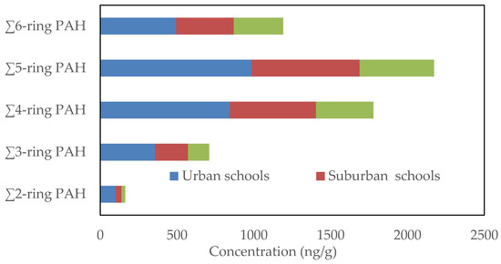 Spatial differences in the average concentrations of the individual particle-bound PAH compounds in collected classroom AC filter dust from urban, suburban and residential schools in Jeddah are shown in Figure 3. The average concentrations of the individual PAH compounds were higher in urban schools than in suburban and residential schools. The most abundant classroom dust-bound PAHs were BbF, BGP, CRY and DBA at urban and suburban schools and BbF, BGP, FLT and IND at residential schools. The average concentrations of individual PAH compounds ranged from 55.34 ng/g (ACY) to 324.89 ng/g (BbF) at urban schools, from 23.27 ng/g (ACE) to 250.0 ng/g (BGP) at suburban schools and from 15.35 ng/g (ACY) to 193.16 ng/g (BGP) at residential schools. Based on aromatic ring number, the classroom dust-bound PAHs with five aromatic rings were the most abundant, followed by four aromatic rings, six aromatic rings, three aromatic rings and two aromatic rings at the different schools (Figure 4). The average concentrations were 985.5, 703.7 and 483.1 ng/g for five aromatic rings, 843.9, 560.6 and 373.7 ng/g for four aromatic rings, 493.9, 373.4 and 321.4 ng/g for six aromatic rings, 357.1, 214.1 and 138.1 ng/g for three aromatic rings and 101.3, 37.7 and 12.6 ng/g for two aromatic rings at urban, suburban and residential schools, respectively. Based on the concentrations of ∑PAH compounds in each schools of different areas, they could be classified as follows: urban schools > suburban schools > residential schools. The concentrations of the ΣPAH compounds were 2781.7, 1891.4 and 1339.9 ng/g at urban, suburban and residential schools, respectively. Vehicular traffic emissions are the main sources of particle-bound PAH compounds in the outdoor environment [93,94,95,96]. The wide differences in the level of PAH compounds among schools in different areas result from the differences in traffic emissions due to the differences in traffic density, since the relatively higher traffic density around the urban schools compared with suburban and residential schools leads to an increase in the emission of PAHs in outdoor and then consequently in the indoor environment of urban schools through penetration.