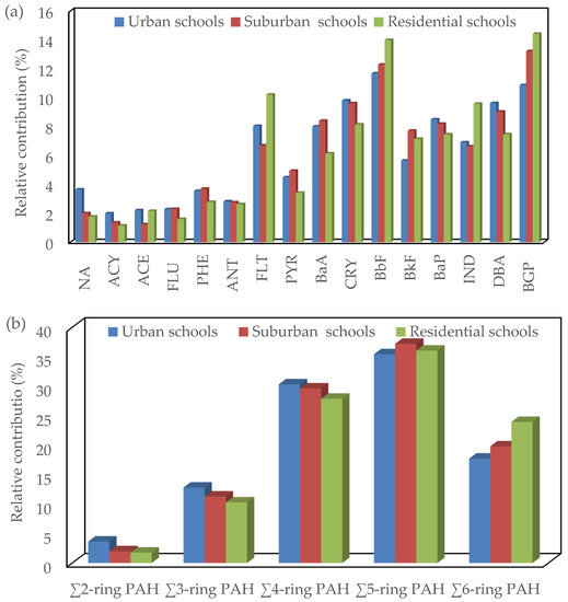 Relative contribution of each individual PAH compound and different categories of PAHs based on aromatic ring number to the total PAHs concentrations in classroom AC filter dust of different schools: (a) individual PAH compounds and (b) two to six-ring PAHs.