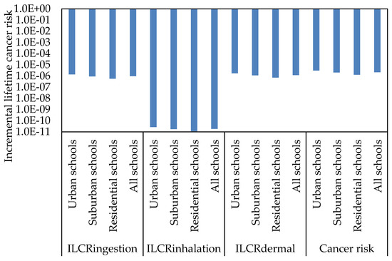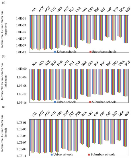 To identify the potential cancer risks to children exposed to classroom dust-bound PAHs, the ILCR for the ingestion (ILCingesion), inhalation (ILCRinhalation), and dermal (ILCRdermal) pathways needs to be calculated, based on the values of toxic equivalent of BaP (TEF) and cancer slope factor (CSF). ILCR values of ≤10−6 indicate virtual safety, values between 10−6 and 10−4 suggest potential risk, and values more than 10−4 suggest a potentially high risk [69,116]. The ILCR assessment of the individual PAH compound concentrations in the classroom dust of different schools through ingestion, inhalation, and dermal contact pathways was performed for children (Figure 6, Figure 7 and Figure 8). Based on the calculated ILCR values from individual and ∑PAHs exposure in classroom dust, the sequence of cancer risk (ILCingestion, ILCRinhalation, ILCRdermal and total lifetime cancer risk (TLCR)) was urban schools > suburban schools > residential schools. This variation in cancer risks between the schools indicates large effects of outdoor source emissions of PAHs on the health risk to children. Among the PAH compounds, DBA, BaP, BbF, BaA, BkF, and IND showed high ILCRingestion, ILCRinhalation and ILCRdermal values compared with other PAH compounds in the different schools and in all schools. The values of LCR and TLCR were in the order of ingestion > dermal contact > inhalation pathways at all the different schools. The higher cancer risk values for direct ingestion than the corresponding risk values for dermal contact and inhalation may be attributed to hand-to-mouth activity in children. This is in agreement with previous studies [67,69,78] which reported that young children were the most sensitive subpopulation due to their hand-to-mouth activity. In the present study, the values of LCR and TLCR were lower than 10−6, indicating virtual safety at all schools.
