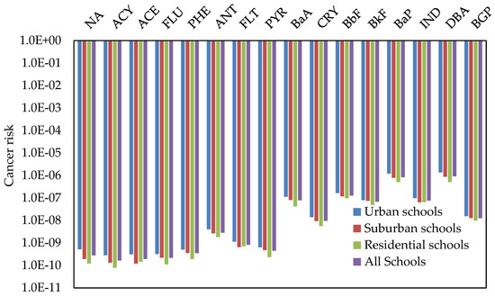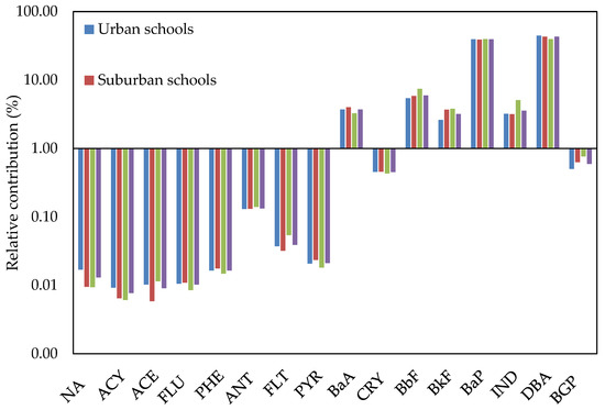The highest average concentrations of total carcinogenic activity (TCA) for all measured PAHs were found in urban schools, whereas the lowest were found in residential schools. These represent 21.59% (urban schools), 20.99% (suburban schools), 18.88% (residential schools) and 20.79% (all schools) of the total PAH concentrations. DBA and BaP compounds were the most dominant contributors to the TCA, indicating the significance of BaP and DBA as surrogate compounds for PAHs in indoor air of schools located in traffic areas.