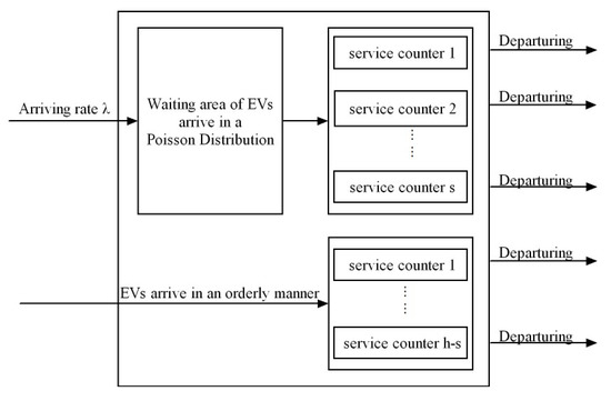 (3) EV drivers will give priority to the reservation service and the reserved EVs will arrive in an orderly manner. The queuing system is shown in Figure 2.