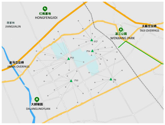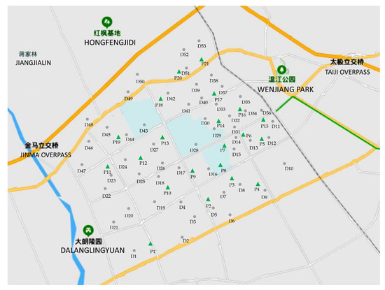 To verify the feasibility and effectiveness of the proposed method in this paper, the actual road system in the urban area of Wenjiang, Chengdu, China, was used. This area is approximately 36 km2, and the number of cars is about 18,061. By analyzing the distribution of cars and the road system, 53 demand nodes were identified and the number of cars at each demand node was estimated, as shown in Table 2. Parking lots could be transformed into centralized quick charging stations. Therefore, 21 parking lots in this area were taken as alternative charging stations, taking natural environment, geographical space, and other factors into consideration. The map is shown in Figure 3. The distances between demand nodes and alternative charging stations are the shortest traveling distances measured by the Baidu map tool, as shown in Table A1 of Appendix A.