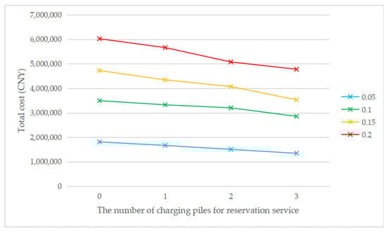 In theoretical research, the impact of reservation services has been considered in many queuing scenarios [61,62]. Long queues for charging have also been one of the important factors hindering the development of the electric car industry. However, in the area of EVCS location, few people have considered the impact of a reservation service. Therefore, this paper introduces a reservation service into the EVCS location problem. Through a comparative analysis, it can be found that the introduction of a reservation service has a positive impact, as it can reduce the total cost compared with no reservation service. The more charging piles for the reservation service, the less it costs. Meanwhile, the larger the EV penetration rate, the more obvious the advantages of the reservation service.