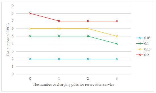 The number of EVCS with changing the number of charging piles for the reservation service under different penetration rates.