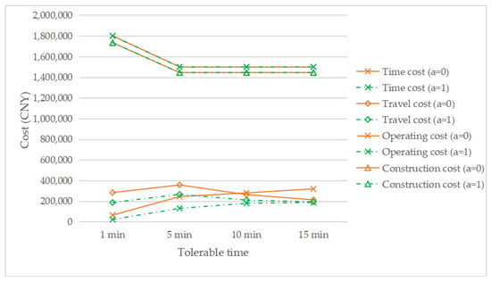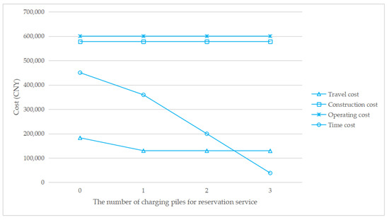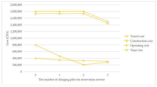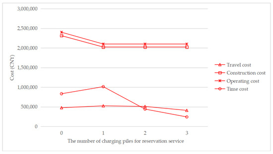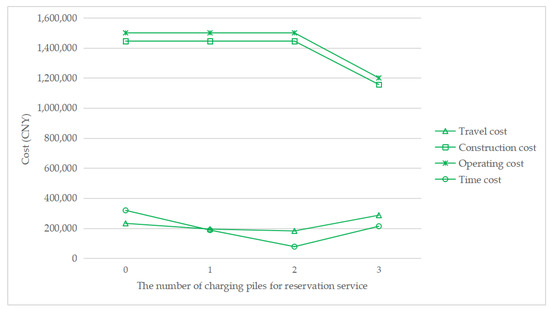 To understand how the reservation service affects the total cost, Figure 7, Figure 8, Figure 9 and Figure 10 show the cost structure with a changing number of charging piles for the reservation service under different penetration rates. It can be seen that the construction cost curve is always parallel to the operating cost curve, because in this paper, there is a linear conversion factor between the construction cost and the operating cost. As shown in Figure 7, when τ = 0.05, with the increase in the number of charging piles providing reservation services, the waiting time significantly decreases, and the driving cost also slightly decreases. However, when τ = 0.1, the number of charging piles providing the reservation service increases from 2 to 3, and the cost of waiting time and driving increases. A similar situation happens when τ = 0.15 and τ = 0.2. This seems unreasonable because drivers who have a reservation do not need to wait. However, Figure 6 shows that this unusual situation can be clearly explained. When τ = 0.1 and a = 3, the number of EVCS planned to be built is less than that under τ = 0.1 and a = 2, and as the number of EVCS decrease, the overall service capacity of the region decreases, resulting in an increase in waiting time.