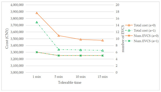As shown in Figure 5, when the penetration rate is the same, the cost without considering the reservation service is always higher than the cost considering the reservation service, which means that the introduction of the reservation service has a positive impact on the EVCS location problem. Meanwhile, with the increase in the number of charging piles providing the reservation service, the total cost gradually decreases. The total cost always increases with the increase of penetration rate, regardless of the number of charging piles for the reservation service. This is consistent with reality, as the total number of chargers will increase to meet the increasing charging demand due to the increase in the total number of EVs. The construction cost is the main component in the cost structure. Figure 6 shows that the introduction of reservation services may reduce the number of EVCS needed. It can be seen that when τ = 0.1, τ = 0.15, or τ = 0.2, the introduction of the reservation service will reduce the number of EVCS required but not when τ = 0.05. It is also consistent with reality, because the introduction of the reservation service mainly affects the waiting time constraint, and when the penetration rate is low, the waiting time constraint is weak. When the penetration rate increases, the waiting time constraint is stronger, and the reservation service is more effective. The above analysis indicates that the introduction of the reservation service plays a positive role in reducing the total cost and improving social benefits. Meanwhile, the greater the penetration rate is, the more obvious the advantages of the reservation service will be.