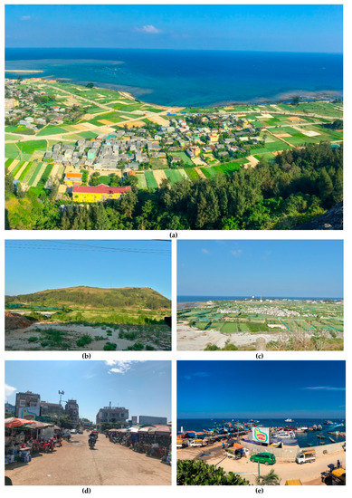 The total landscape and tourism areas on Ly Son Island (photo by authors, 2018). (a) Overview of Ly Son landscape; (b) mountainous forests; (c) farming tourism areas; (d) residential tourism recreations (R); (e) the sandy coasts of the island (C).