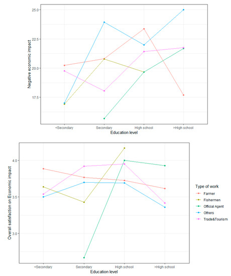 Types of work and education levels are two important factors in predicting the satisfaction of the residents. The two-factor ANOVA confirmed the interaction plots of the tourism attitude dimensions on education levels by different types of work, controlling the effects of the variables related to tourism attitudes (i.e., gender, marital status, age, social network). The two-factor ANOVA results show a significant interaction for “Education level” ”Type of work” and on negative and overall economic scores (Figure 2), on positive and overall socio-cultural scores (Figure 3), and on negative and overall environmental scores (Figure 4). The effects of “Education level” on tourism impacts are moderated by “Type of work”.