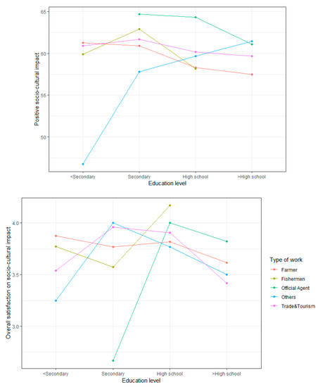 The interaction between “Education level” and “Type of work” is a significant predictor of the positive aspects and overall socio-cultural impact. Free laborers with primary level of education or below felt least pessimistic, while those with above a high-school level worried the most in terms of the socio-cultural impacts of tourism. Farmers with a primary level of education or below ranked first in scores but those with highest educated level worried least. Officials worried more than other groups. In the overall socio-cultural satisfaction, a difference is seen between the “Secondary” group and the “High school” group: officials and fishermen with a secondary level of education were the two least satisfied groups, while those with a high-school level became the two most satisfied groups out of the five. The interaction increases the adjusted R-squared in the positive model by 3.44% and confirms the additive effect in the negative model.