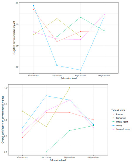 A two-factor ANOVA showed the significant contribution of the interaction between “Education level” and “Type of work” on the environmental impact. Regarding negative environmental scores, for residents with primary level of education or below, farmers ranked first, free labors ranked second, and trade and tourism services were the least. This comparison changes a lot for residents who obtained a higher education level: farmers worried the least (together with officials), those belonging to trade and tourism services worried most, followed by free laborers. Regarding overall environmental scores, a difference was observed between the primary education or below group and the higher education level: farmers in the first group felt least satisfied but most satisfied in the second one; those working in the trade and tourism service ranked third for satisfaction but fell down to the last. The interaction and these two factors explain 13.58% of the total variance in the negative model and 14.2% in the overall model, which is a substantial contribution to the whole model.