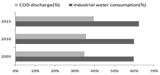 The Yangtze River Economic Belt (hereafter, YREB) is one of the most active areas in economic and social development in China, and is also an important ecological corridor from west to east across China. In recent years, China has exerted great efforts in environmental protection and ecological civilization construction. The quality of water resources in YREB has improved steadily, but the ecological system in YREB is still weak and the risk of pollution is still high. Water protection in YREB still has a long way to go especially considering the balance of economic development and water protection. Since 2008, the Chinese government has issued a series of water environmental laws and policies such as the “Amendment of China Water Pollution Prevention and Control Law”, “Opinions on Implementing the Strictest Water Resources Management System” and the “Water Pollution Prevention and Control Action Plan”, which have imposed the strictest requirements on water conservation in China. Under the influence of new water-related regulations and policies, the discharge of pollutants from industrial sewage in China has continued to decrease. Figure 1 reveals the total chemical oxygen demand (COD) discharge of sewage in China’s top 10 water-intensive industries (including industries of textiles, paper-making, metal smelting, chemical, power generation, etc.). According to Figure 1, the COD discharge of sewage in the top 10 water-intensive industries across China in 2015 has dropped over 50% compared to that in 2005. However, as the overall COD discharge is still large, the task of controlling industrial sewage and related pollutants remains severe. YREB is a cluster area for China’s water-intensive industries. For example, according to China’s industry statistical yearbooks, since 2005, the yearly output value of chemical fiber products in YREB has accounted for more than 70% of the total amount in China. This has brought tremendous pressure on industrial water using and sewage discharge in YREB. According to Figure 2, in each year of 2005, 2010 and 2015, the amount of industrial water consumption in YREB has accounted for over 60% of the total amount in China, and the amount of industrial COD discharge has accounted for over 30% of the total amount in China. It is urgent to promote green productivity and green transformation development in terms of industrial water resources in YREB.