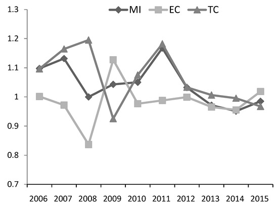 Figure 5 and Figure 6 show the dynamics of the MI index and the decomposition index during 2006–2015. According to Figure 5, although the MI index was fluctuating during 2006–2015, it was greater than 1 in most years, indicating that the green productivity was increasing in most years since 2006. TC index was greater than 1 in most years, but the growth rate was slowing down after 2011. The trend of TC index was similar to that of MI index, which means the technical change was the main factor affecting productivity change.