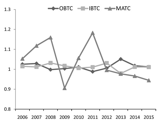 Figure 6 shows the dynamics of biased technical change index, including OBTC, IBTC and MATC. According to Figure 6, although less fluctuating compared to the MATC index, the OBTC index and the IBTC index all present the volatility, and they were greater than 1 in most years from 2006 to 2015. Figure 6 revealed consistent findings with Table 4. Although the neutral technical change had a greater impact on the productivity change, the technical change had also experienced the input and output bias simultaneously, and the biased technical change had increased the productivity in most years from 2006 to 2015.