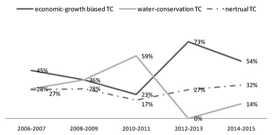 Furthermore, within regions where IBTC > 1, the proportion of regions with labor-using biased technical change was larger than those with water-using biased technical change in each two-year period from 2008, which means the labor-using or water-saving biased technical change was becoming the dominant force to promote productivity from 2008 to 2015.