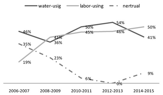However, according to Figure 9, the dynamic analysis shows that the proportion of regions experiencing labor-using biased technical change was catching up from 2008. With the increasingly rigorous water regulation, the cost of industrial water was not as cheap as before, the cost advantage of water factor over labor factor in the industrial production was decreasing, more enterprises were seeking technologies to use more labor and save water. Therefore, the labor-using biased or water-saving biased technical change was catching up from 2008 to 2015 in YREB.