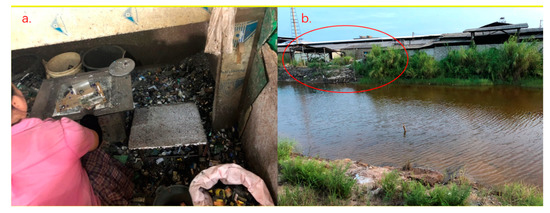 Despite relying on low-level technologies and manual labor, a deep, subtle, and comprehensive division of labor was observed in Guiyu. Family workshops were respectively specialized in variegated types of e-waste collection, sales, processing, second-hand electronic components trade, raw materials extraction and sales. Among the variegated types of e-waste economies, circuit boards baking (CBB), precious metal extraction, and plastics disposal were the three main sources of pollution. CBB was the most important type of e-waste economy that contributes to the global infamy of Guiyu. Local people used coal stoves and liquid tin to melt the soldering points of circuit boards and taken the varied categories of useful electronic components from the board (see Figure 2a). After useful elements were taken down, the left circuit boards and those dysfunctional components would be used for precious metal extraction, which was conducted in two forms. The first was to put them into incinerators to recover valuable metals through pyrometallurgy. The second was hydrometallurgy, which was known as “gold washing” in the vernacular (Figure 2b was a gold washing workshop near riverways). Highly corrosive strong acids were used in the separation between the precious metals and the plastics contained in circuit boards. Last, the techniques mostly used for plastics disposal in Guiyu were burning and salt brine delamination. Every variety of plastic has a unique smell when it is burnt. Therefore, the recyclers ignited plastics and classified them into different categories by identifying their smell in burning. Because plastics in the varied category have different densities, local recyclers also prepared salt brine at various densities to select plastics. The chemicals used in both “gold washing” and plastics classification were directly discharged into the local waterways as well.