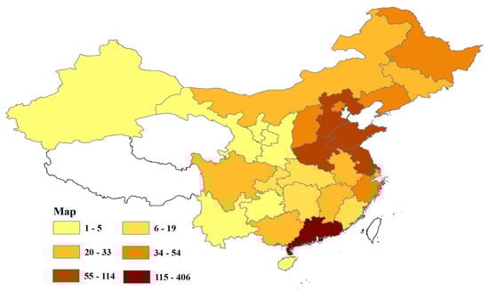 We drew a map displaying the distribution of the regions in China from where the participants’ originated across China by using ArcGIS10.2 (Environmental Systems Research Institute, Redlands, California, USA), which more clearly shows the concentration area of patients and a comparative distribution of patients across the country (Figure 2). We can see the patient distribution from the map. Provinces where the respondents numbered 55 or more were Guangdong Province with 406 respondents, accounting for 31.59%; Jiangsu province with 114 respondents accounts for 8.87%; Shandong province with 99 respondents, accounts for 7.70%; Henan province (with 82 respondents accounts for 6.38%); and Hebei province (with 72 respondents accounts for 5.60%). In our survey, there was no participation from Taiwan, the Tibet autonomous region, the Macauo special administrative region, the Hong Kong special administrative region, Taiwan province, or Qinghai province (Figure 2).