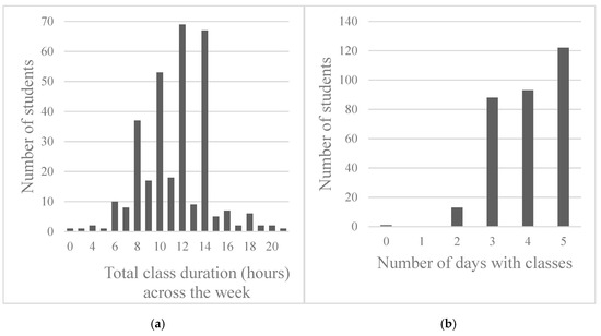 (a) Number of students across the total duration of classes (hours) scheduled across the week; (b) Number of students across the total number of class days scheduled across the week. Class duration (hours) was rounded up. For example, 1.5 h is rounded up to 2.0 h for illustrative purposes.