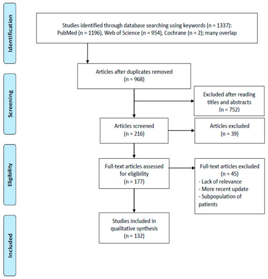 The searches retrieved 968 citations when duplicates were removed (Figure 1). Moreover, 752 papers were excluded after reading their titles and abstracts, and because they were outside the scope of this study. One hundred and seventy-seven full papers were reviewed. Of these, 132 papers in journals with a certified impact factor, with at least an English abstract, and published from 1980 onwards (except for two of the earlier papers that focused on the aim of our study) were selected. Papers that had already been discussed in cited reviews were not included, and instead reviews were included. In addition to the retrieved references were the Guidelines [1,2].