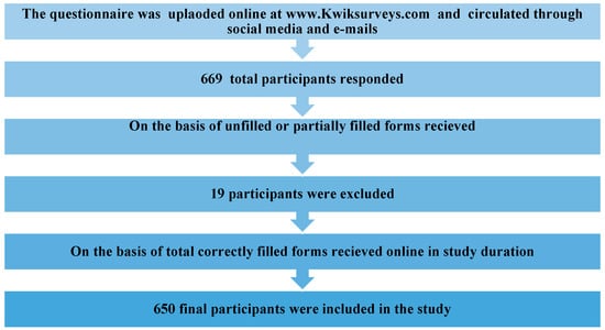 The present cross-sectional study was conducted using an online survey questionnaire from 10th to 17th March 2020. For this purpose, a well-constructed questionnaire was designed at www.Kwiksurveys.com and validated through intra-class correlation with a strong relation of 0.74. The online survey link was circulated through social media and an e-mail to dental professionals and received a response through an online survey submission. Any paramedical staff and dental students were not included in this survey. The questionnaire was comprised of a total of 22 closed-ended questions, which were divided into two sections. The first section focused on the fear among dentists about getting infected with COVID-19 and the second section was designed to gather information about their practice modifications to combat COVID-19 outbreak in accordance with the Centers for Disease Control and Prevention (CDC) and ADA practice guidelines. A total of 669 participants from 30 different countries across the world participated and submitted the questionnaire, excluding 19 unfilled or partially filled forms (Figure 1). An ethical review board approved the study (AIDM/EC/03/2020/20) and statistical analysis was done on SPSS version 25. A Chi-Square and Spearman Correlation test were used to control confounders and assess the relation of dentist response with respect to concerning gender and education level.