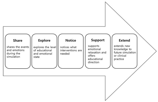 On the basis of categories and the conceptual framework of the present study, the Share–Explore–Notice–Support–Extend (SENSE) model was developed for stress management and emotional support, which is unlike most other debriefing models that emphasize the cognitive aspects of simulation-based learning. In the Share phase, learners share the events and emotions of the simulation practice. The instructor encourages the participants to fully disclose their feelings and the events of the simulation. The Explore phase is a step to analyze the causes of difficulty with the situation or the emotion in the simulation exercise. In the Notice phase, the instructor assesses the learner’s educational level or negative emotion, such as extreme stress or anxiety, and takes note of any help or intervention that is needed. In the Support phase, the instructor encourages students’ learning achievements, offers educational direction, and guides them through emotional relaxation therapy, such as deep breathing and maintaining a healthy lifestyle in order to reduce stress or anxiety. The Extend phase is a step to aid the students in extensively applying their newfound knowledge and experience in future simulation exercises and clinical practice (Figure 2).