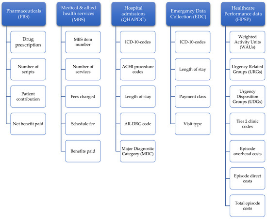 | Healthcare Purchasing & System Performance data (HPSP), HHS Funding Models: National Hospital Cost data (NHCDC) & Patient Activity Weighting (PAWS)/(GenWAU) | To capture healthcare funding related to healthcare records | 1 July 2012–31 December 2016 | - For inpatients: Episode ID, including Year, facility ID and facility unique ID - For ED patients: Year, facility ID, hospital UR number, presentation date (supplied by Statistical Services Branch, Queensland Health) | - Weighted Activity Units (WAUs) - Urgency Related Groups (URGs) - Urgency Disposition Groups (UDGs) - Tier 2 clinic codes - Total episode costs - Overhead costs - Direct costs |