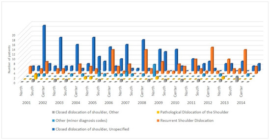 An examination of the National Hospital Discharge reports (SDO) reported at the Italian Ministry of Health concerning the 14 years of the present research (2001 through 2014) was conducted. The SDO collects data on every hospitalization happening in the Italian public and private sectors. This information is anonymous and incorporate patient’s gender, age, domicile, region, and where the hospitalization was performed. National and regional population information was collected from the National Institute for Statistics (ISTAT) annually. Shoulder dislocation was determined by the subsequent International Classification of Diseases, Ninth Revision, Clinical Modification (ICD-9-CM) primary diagnosis code: 831.00 (Closed dislocation of shoulder, unspecified), 718.31 (Recurrent shoulder dislocation), 831.09 (Closed dislocation of shoulder, other). An analysis of shoulder dislocation in young patients was performed. We defined “young”—in agreement with the Italian National Institute for Statistics (ISTAT)—as patients aged between 0–14 years. The considered treatment codes were: 81.82: Reparation of recurrent dislocation of the shoulder; 81.83: Other shoulder repair; 79.71: Closed Shoulder reduction; 79.81: Open Shoulder reduction; 80.21: Shoulder Arthroscopy.