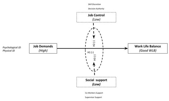 The three previously described job strain variables should have an interactive effect on the WLB of nurses. Additionally, the interaction among these variables can reduce the relationship between job demands and employees’ WLB. Against the reference framework described in the previous paragraphs and based on the literature review, the following research hypotheses are proposed: