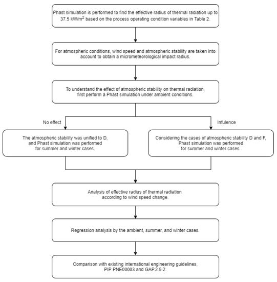 The radius of thermal radiation (up to 37.5 kW/m2) was considered. The methodology flow chart applied in this study is shown in Figure 1. In this study, thermal radiation was analyzed by Phast’s Gaussian model. The Gaussian model is a representative method that is considered for the release of materials that are lighter than air. Since the source material of this study, ethylene, is lighter than air, the Gaussian model was applied. Atmospheric stability was estimated by the temperature difference according to the height and classified into seven categories from A to G. This study was applied based on atmospheric stability D and F according to EPA’s worst-case scenario.