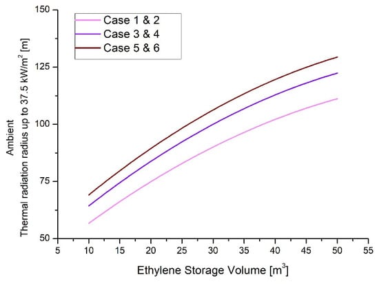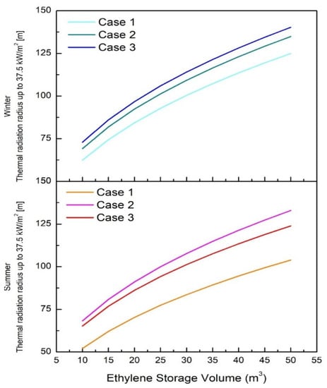 Polynomial fitting of the radius of thermal radiation for each weather case, according to the capacities of ethylene storage under ambient temperature, summer, and winter conditions, provided results with an average reliability of 99.892%. In the summer, changes in the radius of thermal radiation according to wind speed were not observed, but in the case of ambient temperature and winter, the radius of thermal radiation increased with increase in wind speed.