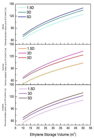 Thermal radiation radius up to 37.5 kW/m2 according to ethylene storage capacity in ambient temperature (25 °C), summer (40 °C), and winter (0 °C) conditions.