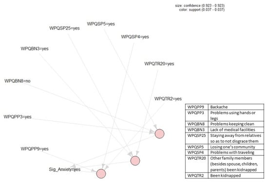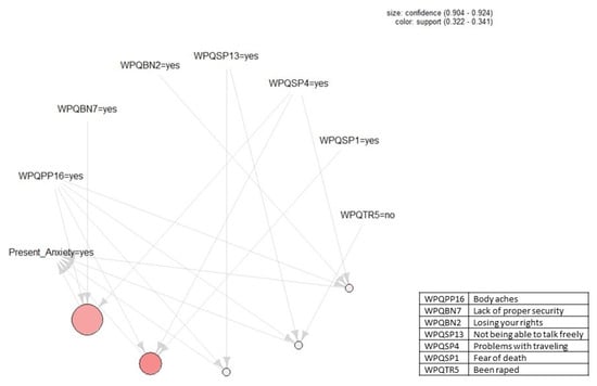 Two threshold values of and were set to construct these rules for support and confidence, respectively. This indicates that all rules have confidence of at least 90% and support of at least 30%. For example, for the rule presented in Equation (1) above, 30% of respondents (112 people) answered yes to all four variables of I = {Problems with travel, Lack of proper security, Body aches, Some anxiety}. In addition, 90% of respondents (100 people) that answered yes to all the variables in LHS = {Problems with travel, Body aches, Lack of proper security} also answered yes to RHS = {Some anxiety}. The threshold levels of and are mainly related to the dataset size and the number of respondents who answered yes to the R. Considering the current dataset’s size, we selected threshold values such that we can have as large a possible number of respondents for each rule to generate strong rules with large confidence. Lowering the level of support results in generating rules that sometimes are redundant and supported by a small number of transactions, whereas selecting a higher support threshold might result in not generating any rules. We decided to start from the support threshold of which refers to 112 respondents who answered yes to the variables constructing each rule and to decrease the threshold if needed.