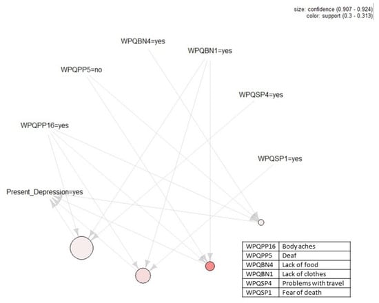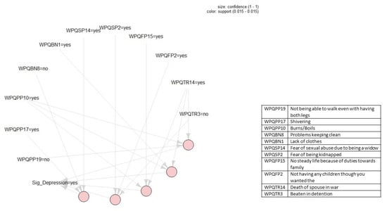 Lastly, five association rules that identify those traumatic events and stressors that were associated with some depression in the current dataset can be found in Figure 4. For constructing these rules, we set a threshold value for the confidence of . However, the threshold value for support had to be set at given that only little over 15% of respondents indicated that they had severe depression. As can be seen in Figure 4, all five rules had the same confidence level as indicated by the similar size of each of the circles representing the rules () as well as the same support level as indicated by the shade of the circle (. Moving from Figure 4’s left-hand side to the right-hand side, the five identified association rules are:
