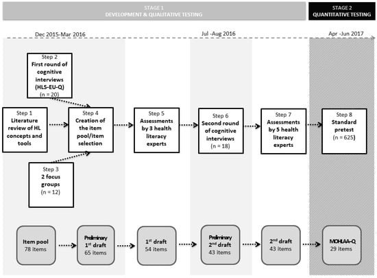 - Firnges, C.; Domanska, O.; Jordan, S. Developing an instrument for measuring the health literacy of adolescents: Lessons learned. In International Handbook of Health Literacy. Research, Practice and Policy Across the Lifespan; Okan, O., Bauer, U., Levin-Zamir, D., Pinheiro, P., Sørensen, K., Eds.; Policy Press University of Bristol: Great Britain, UK, 2019; pp. 99–114. ISBN 978-1447344513. [Google Scholar]
