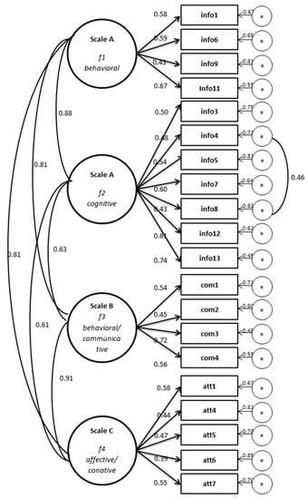 The single-factor solution for the overall model had a poor fit. In the four-factor solution, the goodness-of-fit indices showed substantial improvement. The indices were close to the values considered to indicate sufficient model fit, e.g., CFI > 0.90 and RMSEA less than or close to 0.06 []. Figure 2 shows the final model with a four-factor solution. The range of the standardized factor loadings (cf. Figure 2) was 0.43–0.74 for scale A, 0.45–0.72 for scale B and 0.39–0.58 for scale C. We found a high correlation coefficient for factor 3, behavioral/communicative, and factor 4, affective/conative (0.91), which indicated no clear discrimination between them.