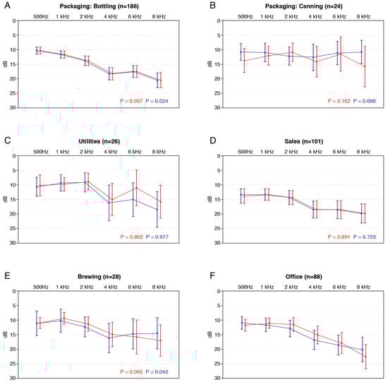 Average air conduction thresholds per department. Both left (blue) and right (red) ear are shown as well as 95% confidence interval. p values for unpaired sample T-test are shown per department versus Office for 4 kHz threshold. (A) Average ear conduction thresholds for employees working at the bottling department; (B) Average ear conduction thresholds for employees working at the canning department; (C) Average ear conduction thresholds for employees working at the utilities department; (D) Average ear conduction thresholds for employees working as Sales representatives; (E) Average ear conduction thresholds for employees working at the brew house (F) Average ear conduction thresholds for employees working in the brewery offices.