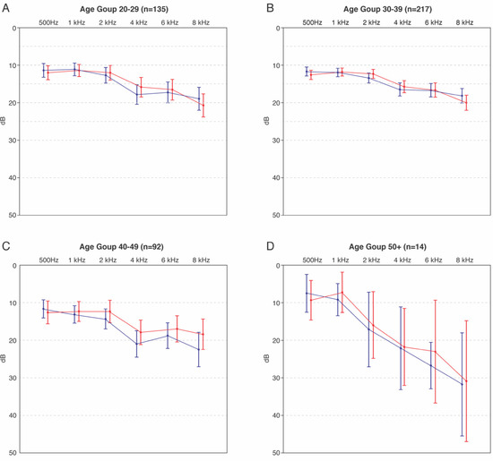 Average air conduction thresholds per age group. Both left (blue) and right (red) ear are shown per group as well as 95% confidence interval. (A) Average air conduction thresholds for subjects between 20 and 29 years of age; (B) Average air conduction thresholds for subjects between 30 and 39 years of age; (C) Average air conduction thresholds for subjects between 40 and 49 years of age; (D) Average air conduction thresholds for subjects between 50 years of age and over.
