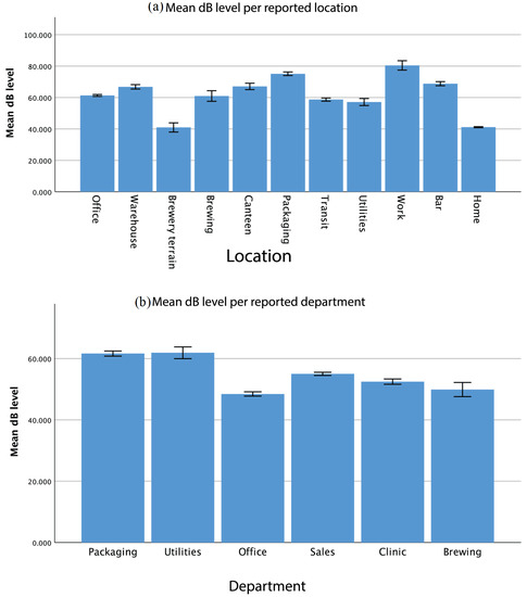 Mean dB levels measured per reported location (a) and per reported department (b); error bars represent the 95% confidence interval.